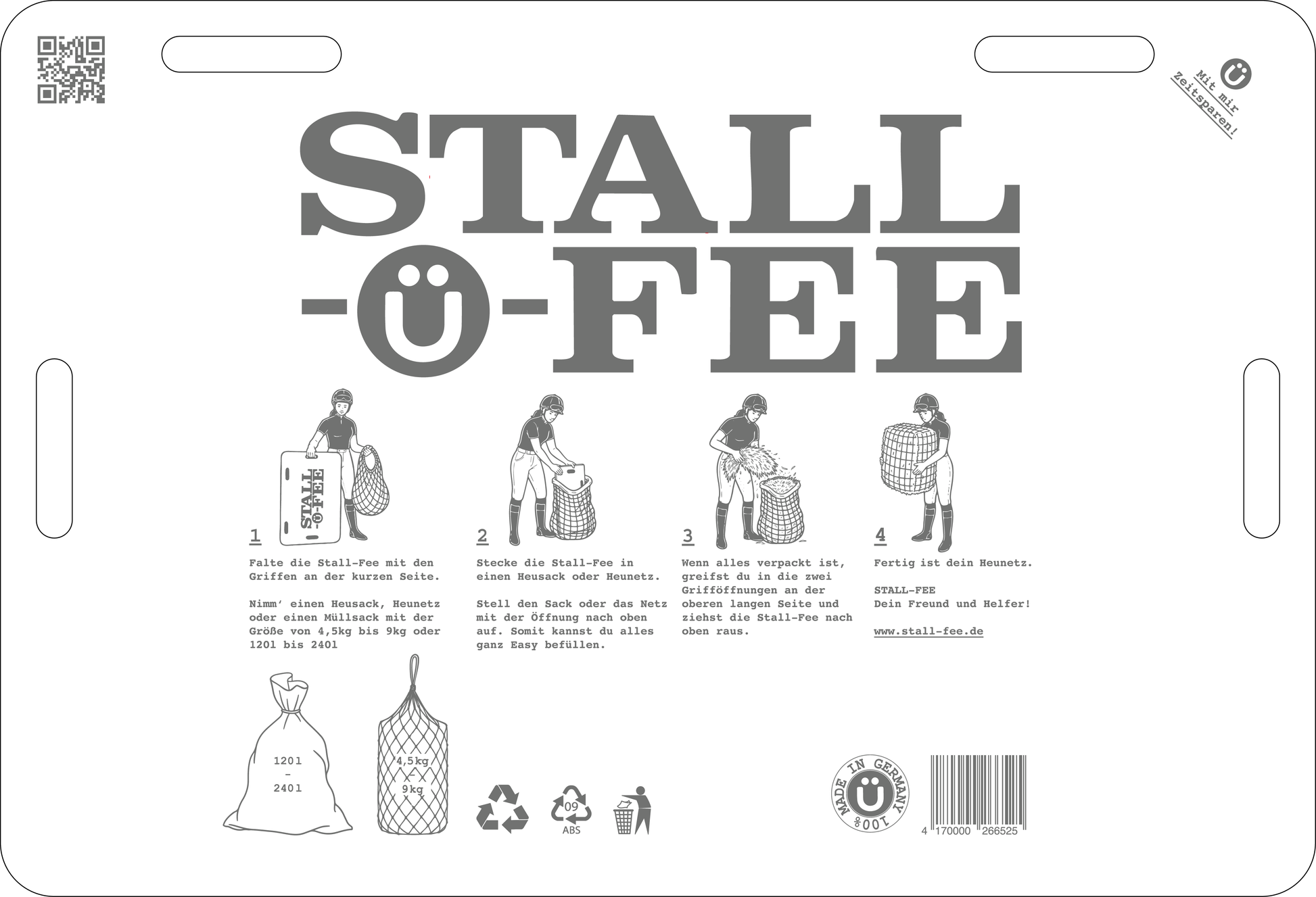 …ein Heunetz einfach und ohne dritte Hand befüllen? Genau dafür ist die Stall-Fee®gemacht. Dieses clevere Tool erleichtert dir die Stallarbeit enorm – beim Füttern, beim Aufräumen und sogar beim Befüllen von Müllsäcken. Ob im Pferdestall, im Offenstall, beim Turnier oder zuhause: Deine neue kleine Helferin ist einfach überall einsetzbar.