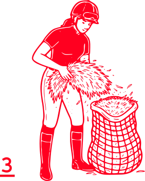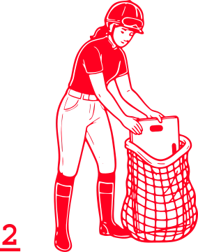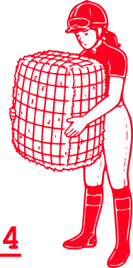 • Falte die Stall-Fee mit den Griffen an der kurzen Seite. Nimm‘ einen Heusack, Heunetz oder einen Müllsack mit der Größe von 4,5kg bis 9kg oder 120l bis 240l.